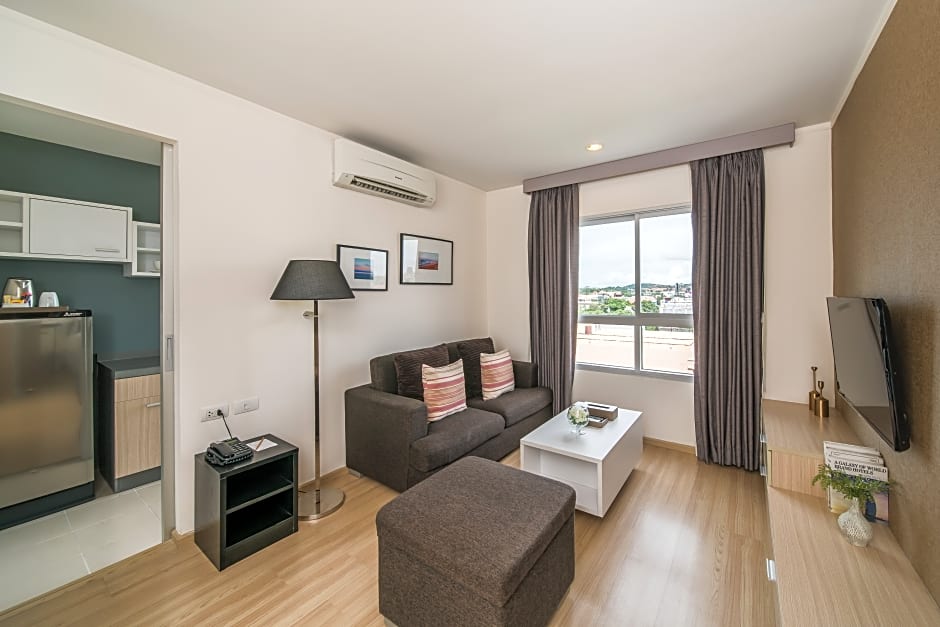 This suite features a sliding glass door separating the bedroom from the living room. A kitchenette can also be found for guests' convenience.